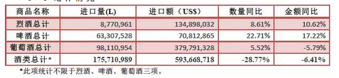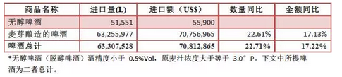 啤酒進(jìn)口呈增長(zhǎng)態(tài)勢(shì),進(jìn)口量6331萬(wàn)升,同比增長(zhǎng)22.7%,進(jìn)口額7081萬(wàn)美元,同比增長(zhǎng)17.2%。