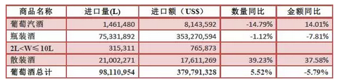 葡萄酒進(jìn)口整體下滑。瓶裝酒量額微幅下降,散裝酒量額升幅明顯,葡萄汽酒量額漲跌互現(xiàn)。瓶裝酒進(jìn)口額3.5億美元,占葡萄酒進(jìn)口總額近93%,同比下降7.8%。