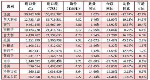1-2月數(shù)據(jù)顯示,法國(guó)、澳大利亞、智利三者占進(jìn)口瓶裝酒市場(chǎng)份額近78%,其中法澳弱勢(shì)運(yùn)行,智利逆勢(shì)上揚(yáng);另一方面,其他瓶裝酒進(jìn)口來(lái)源地互有漲跌。